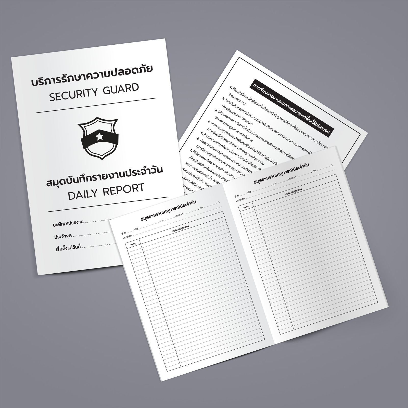 สมุดรักษาความปลอดภัยประจำวัน เล่มขนาด A4 สามารถใช้ได้ทั้งกับ กะกลางวัน และ กะกลางคืน ใช้สำหรับบันทึกรายงานประจำวันของเจ้าหน้าที่รักษาความปลอดภัย เพื่อส่งรายงานให้กับผู้มีส่วนเกี่ยวข้องรูปแบบรายละเอียดครบถ้วน ชัดเจน เข้าใจง่าย ไม่ซับซ้อน 1 เล่ม สามารถใช้ได้ทั้งเดือน